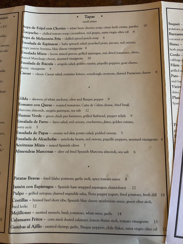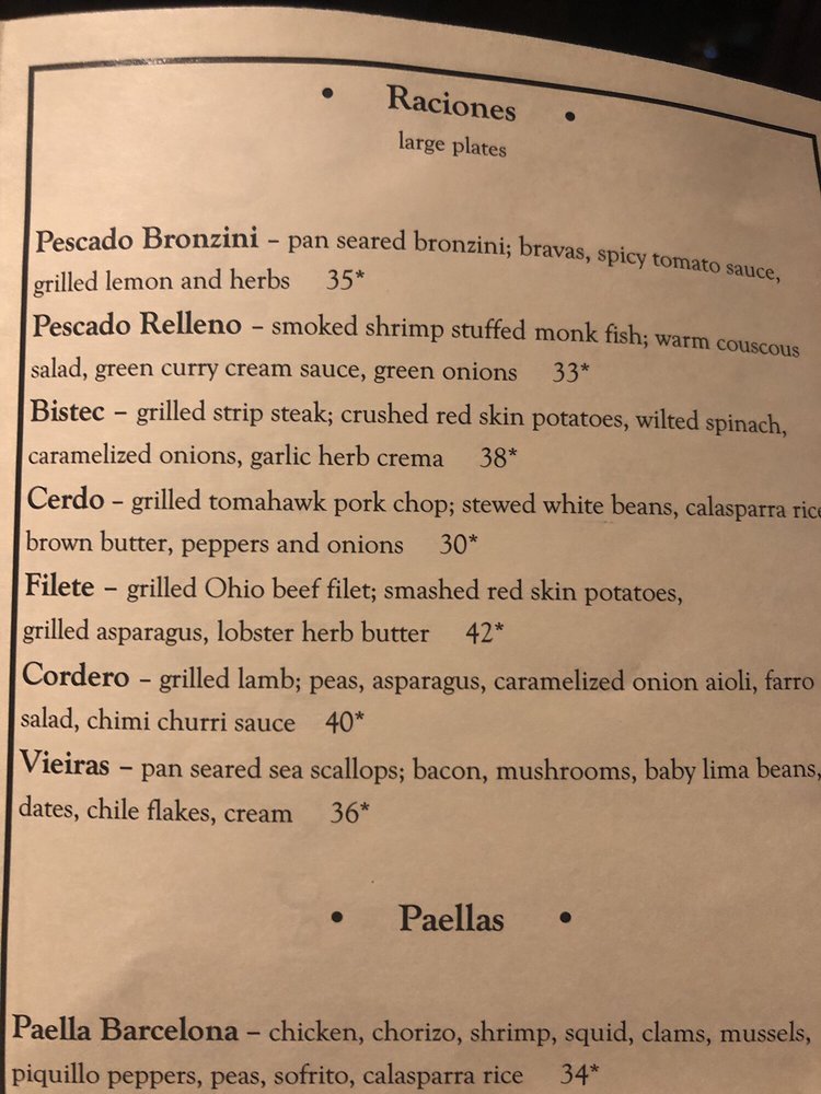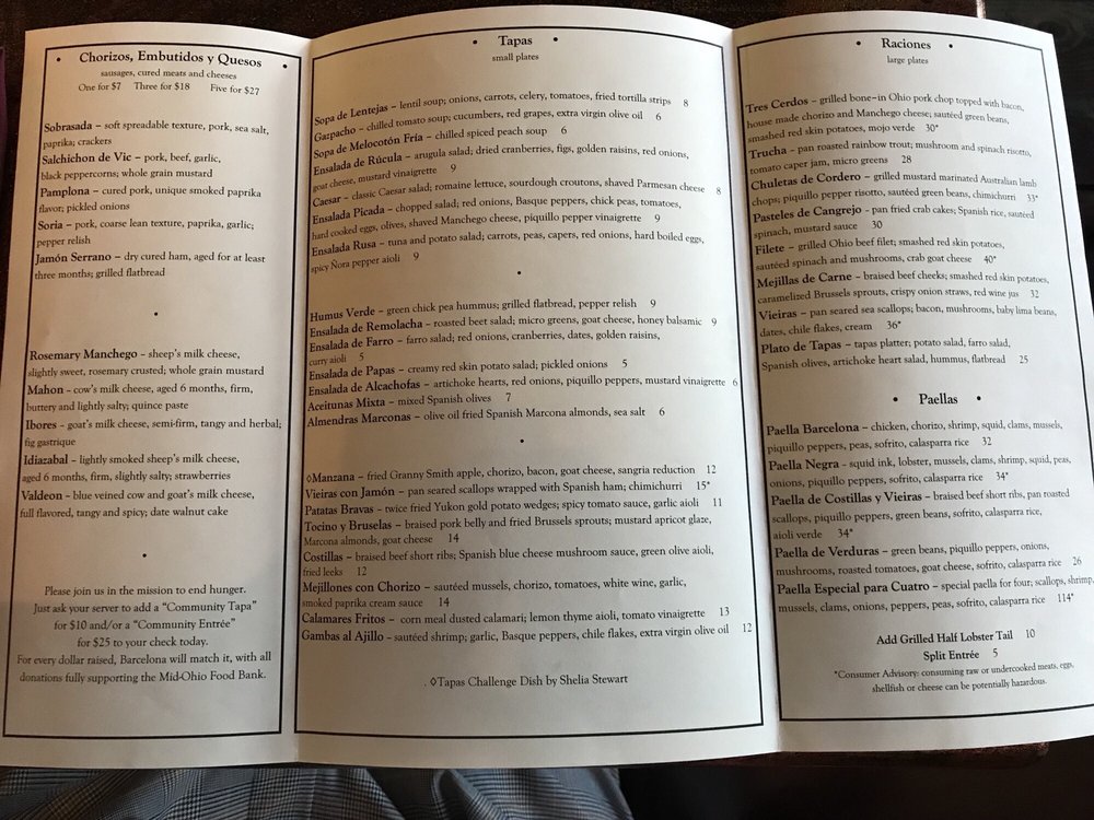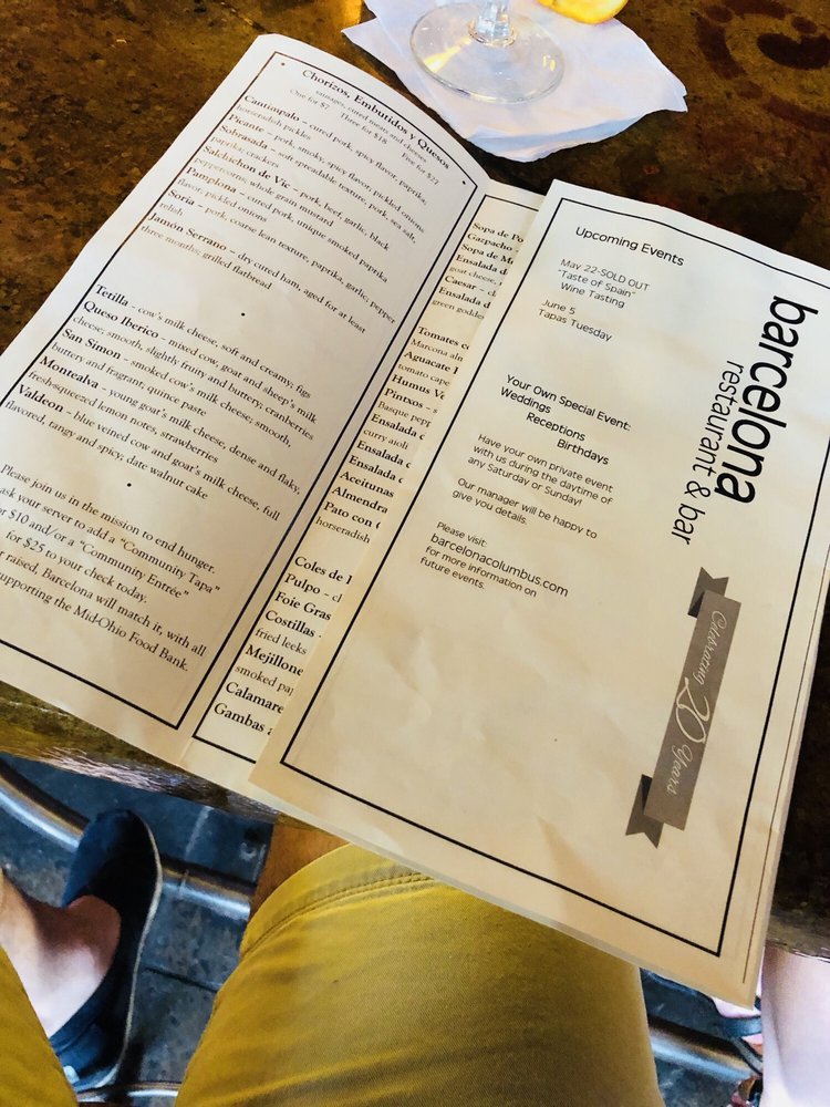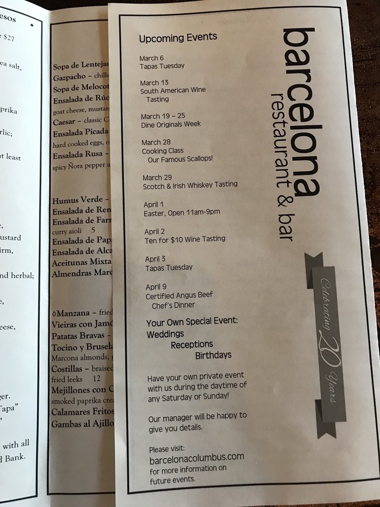 Introducing the menu at Barcelona, an elegant and vibrant restaurant located at 263 E Whittier St in Columbus, Ohio. Barcelona offers a wide range of amenities such as reservation options, delivery, takeout, vegan and vegetarian choices, credit card and Apple Pay acceptance, outdoor seating, catering services, and more. The restaurant has a romantic ambiance with moderate noise levels, making it perfect for a dinner date or gathering with friends. With street and valet parking available, along with free Wi-Fi and happy hour specials, Barcelona caters to diverse customer needs.